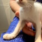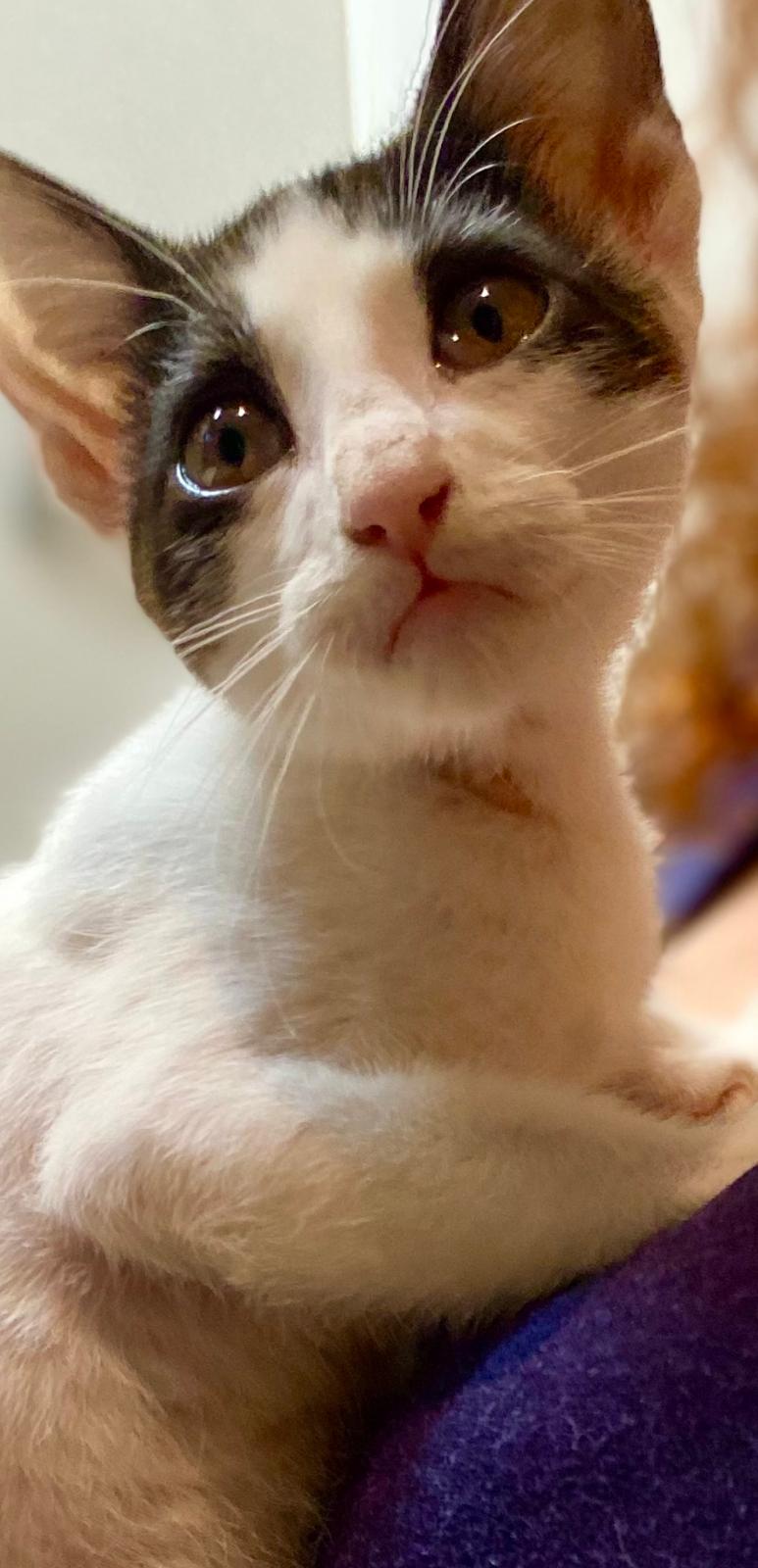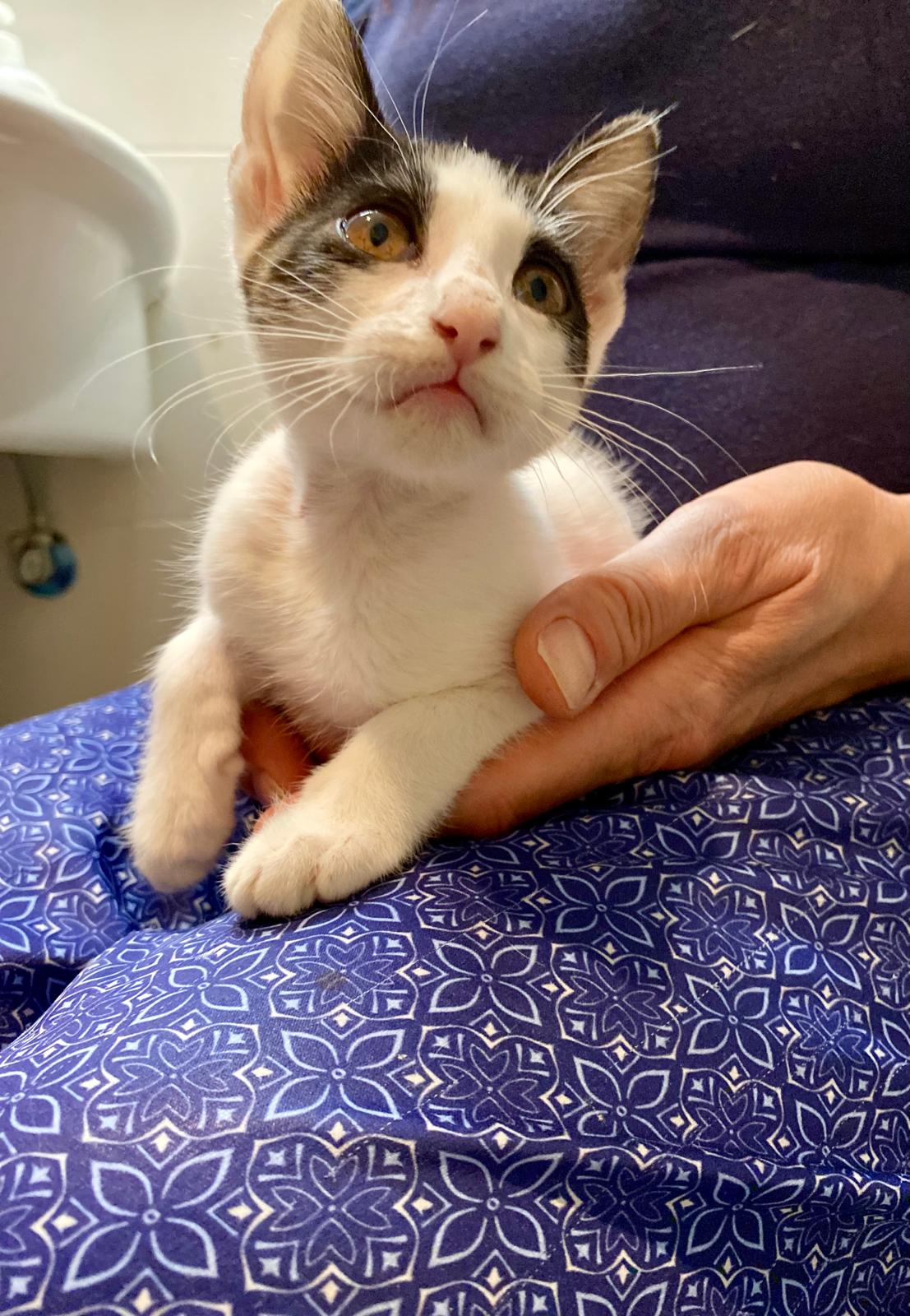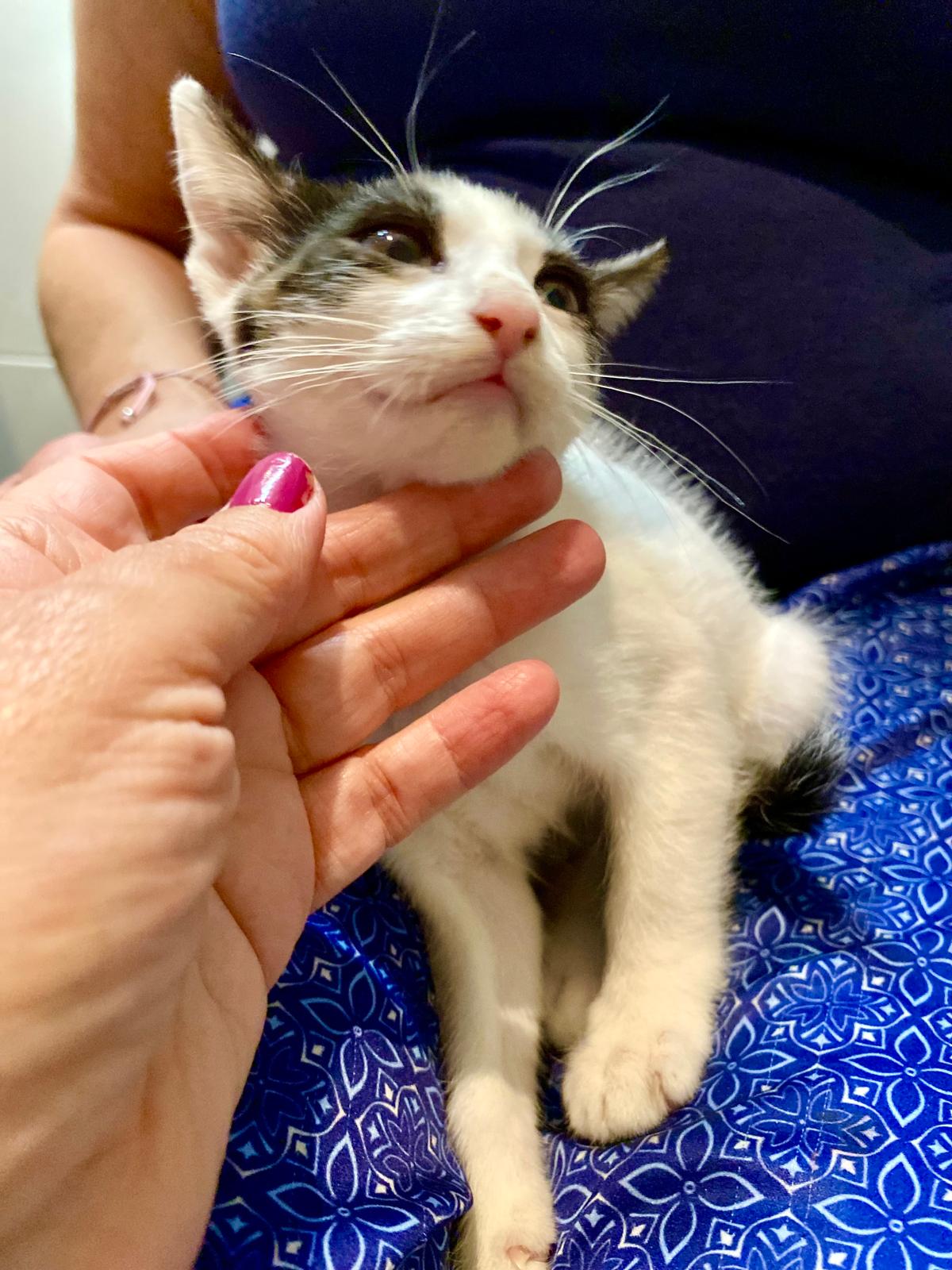Estaba desnutrida y con fiebre, pero ya está recuperada. Come como una tigretona y le encanta jugar. Es una bebé muy buena y sólo llora cuando tiene hambre.
