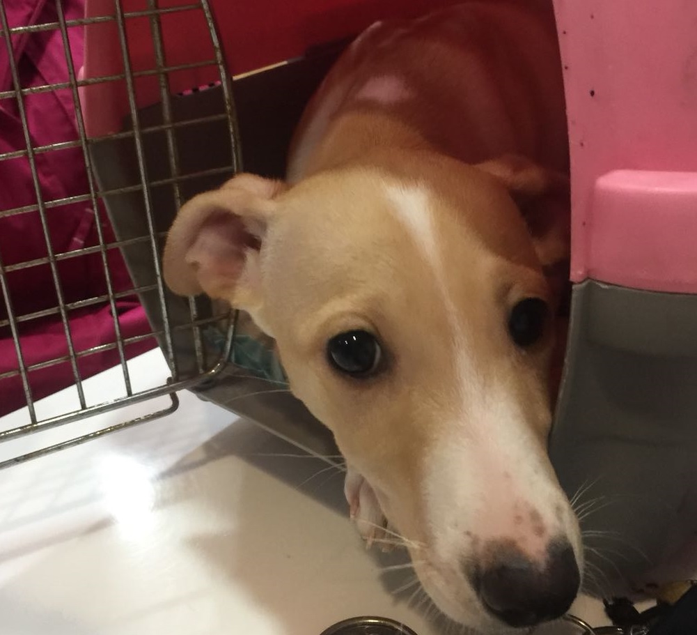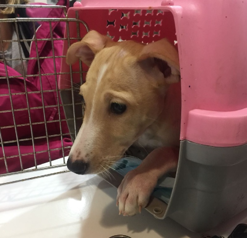 Mix de galguita criada a biberón. Fue abandonada cuando solo era un bebé de dias. Ahora busca una familia que la quiera para siempre.