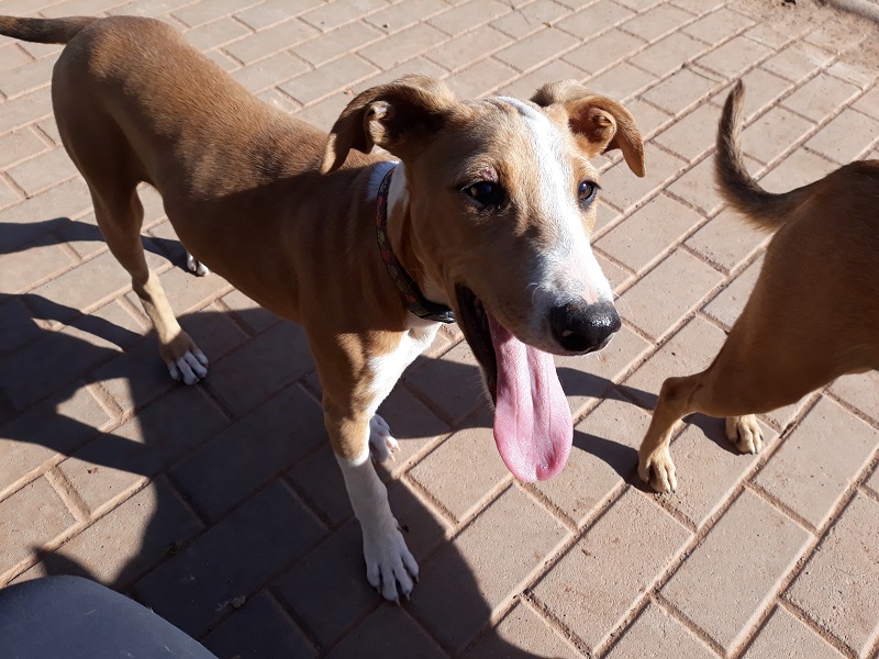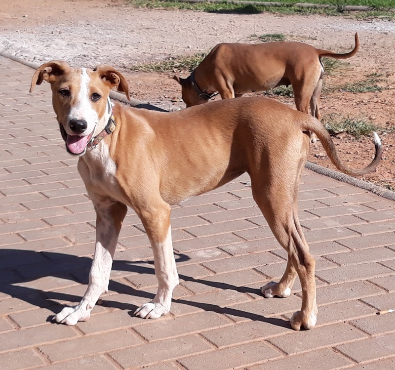Noa es una cachorra rescatada de un terreno donde estaba rodeada de mierda y de basura, se contagió de parvo pero por suerte lo superó. Es muy cariñosa cuando conoce a la persona, los niños le dan un pelín de miedo porque se mueven con mucha energía y es sociable con todos los perros.