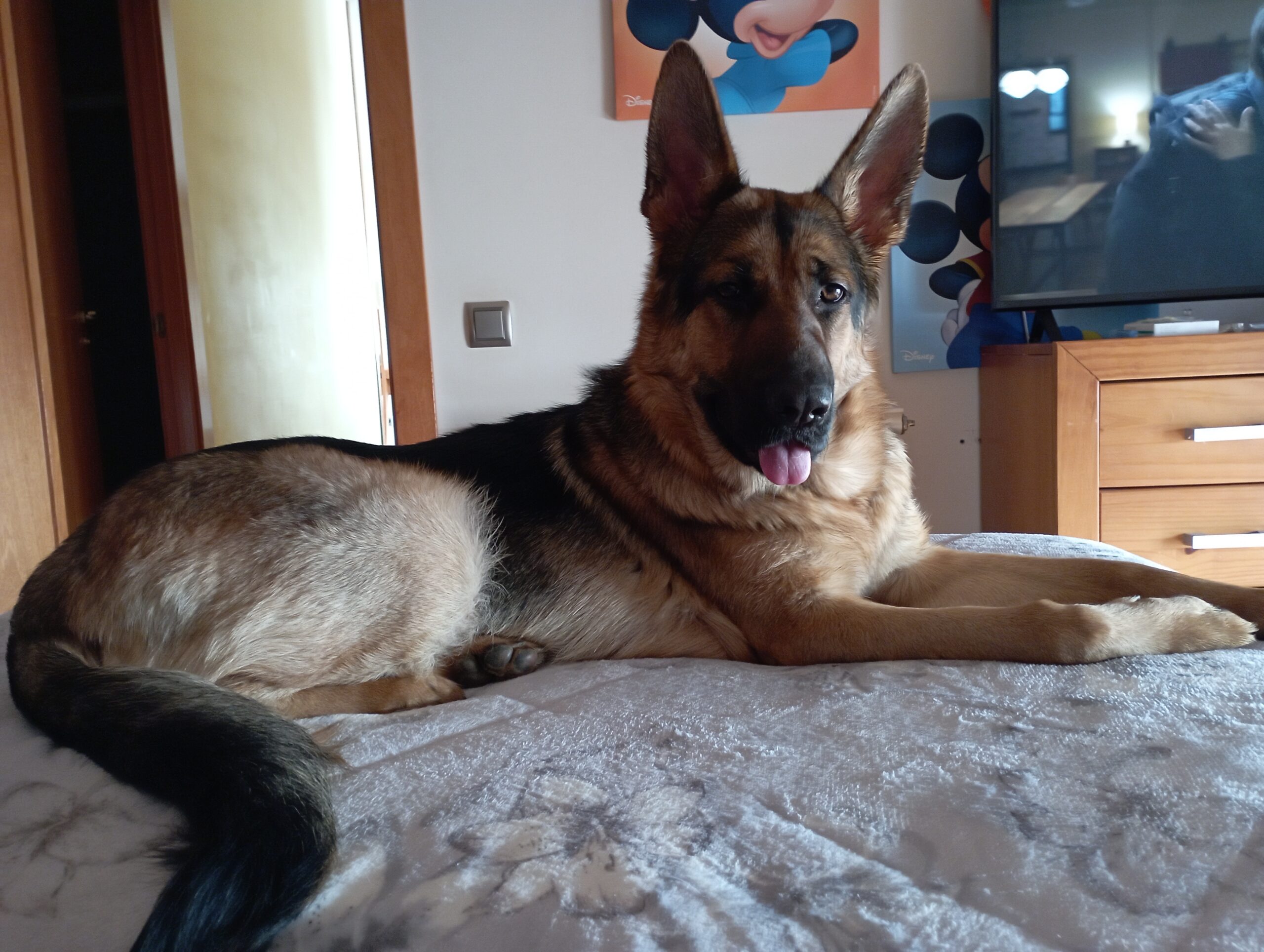 es una hembra joven, nacida el 25/11/2024. fuerte, con ese porte elegante y atento, las orejas bien erguidas y esa mirada despierta que lo dice todo. Tiene un pelaje precioso en tonos marrones y negros, muy brillante y bien cuidado, y una expresión dulce pero segura.